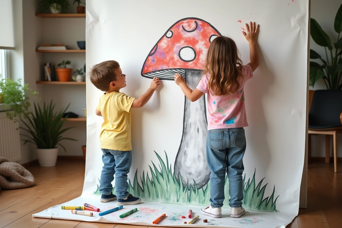 La décoration collective prend forme sans heurt : un champignon stylisé s’allonge, une fleur apparaît, une feuille tournoie sur le papier. L’œuvre évolue à mesure que les enfants la traversent et l’embellissent, chacun laissant son empreinte visible. Une fresque unique, véritable témoin de ce qui se crée à plusieurs, qui transforme un mur anonyme en affiche géante de souvenirs et d’imagination partagée. Rien ne peut vraiment rivaliser avec ce spectacle vibrant qui s’étire bien au-delà du coloriage classique.