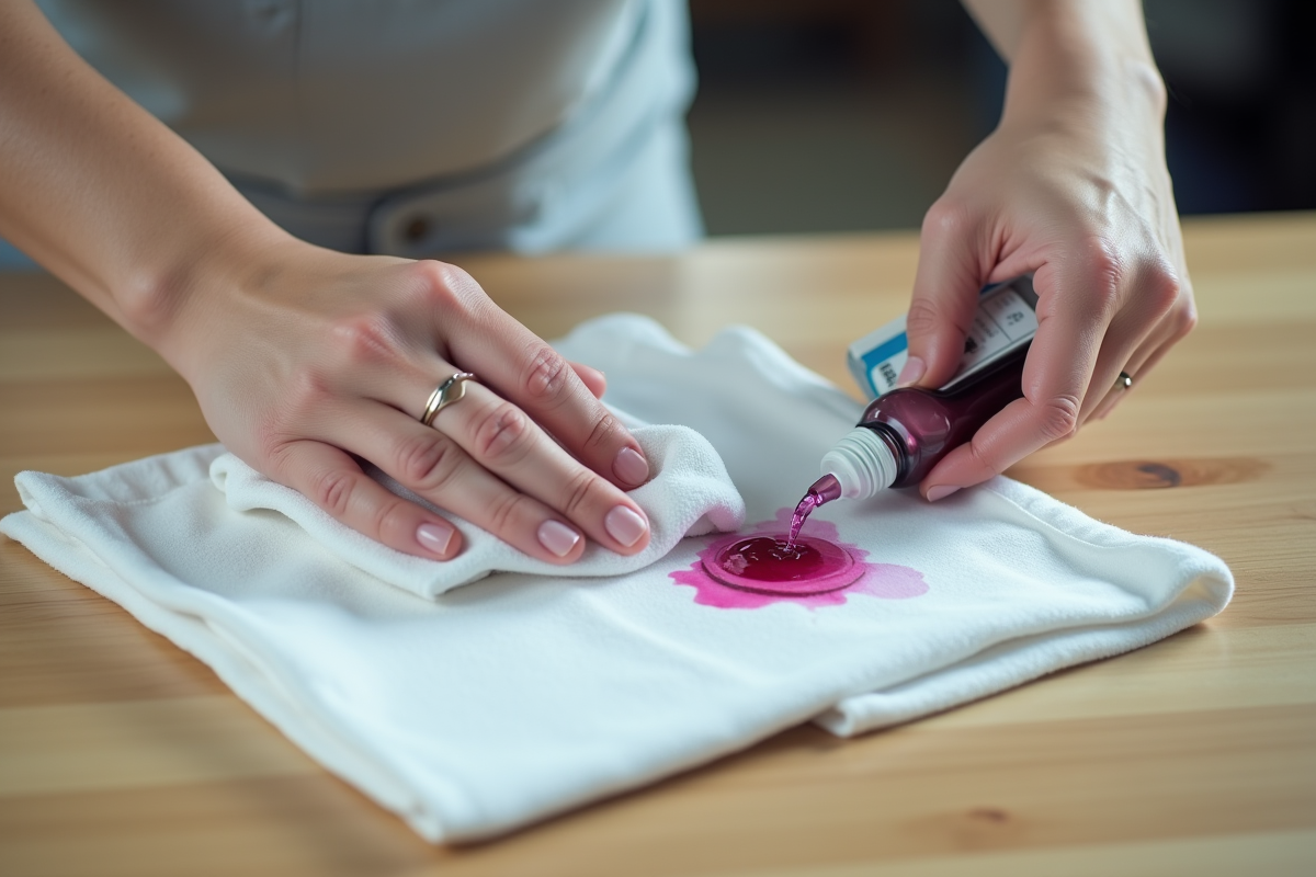 Face à une tache qui ne cède pas, l’alcool à friction peut faire la différence. Imbibez un chiffon, tamponnez la zone concernée, puis rincez à l’eau froide.